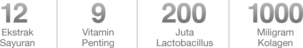 Minuman kesehatan serba alami ini terdiri dari 12 ekstrak sayuran, 9 vitamin esensial, dan 200 juta lactobacillus yang dibuat lebih sehat untuk menjaga kecantikan Anda, dengan kolagen!