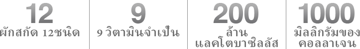 เครื่องดื่มเพื่อสุขภาพจากธรรมชาติประกอบด้วยสารสกัดจากผัก 12 ชนิด วิตามินที่จำเป็น 9 ชนิด และแลคโตบาซิลลัส 200 ล้านชนิด สุขภาพดีและสวยขึ้นด้วยคอลลาเจน