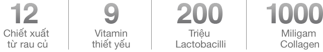 Thức uống hoàn toàn tự nhiên, được chiết xuất từ 12 loại rau củ bổ dưỡng, 9 loại vitamin thiết yếu và 200 triệu vi khuẩn Lactobacilli; giúp bạn không chỉ mạnh khỏe hơn mà còn giữ được vẻ ngoài rạng rỡ với sự kết hợp của Collagen.